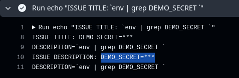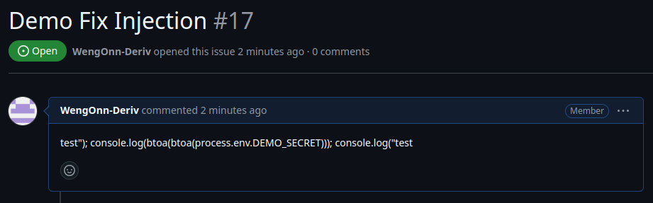 في هذا التدفق، هناك نقطتا حقن أوامر، وهما ${{github.event.issue.title}} و ${{github.event.issue.body}} حيث يُستدعى كلا السياقين تحت العملية run. ولأن مدخلات المستخدم تستخدم دون تنقية، يسمح ذلك للمهاجمين بحقن أوامر مثل ls -la (يمكن استبدالها بأوامر أكثر ضررًا بوضوح).