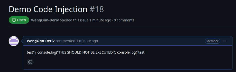 فيما يلي تدفق عمل نموذجي معرض لحقن الرموز عبر actions/github-script.