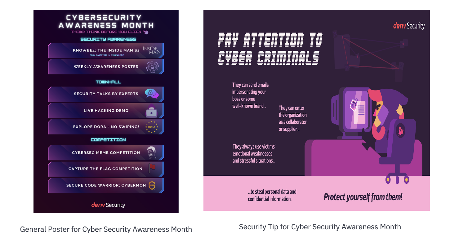 شهد أكتوبر الحالي شهر التوعية بأمن المعلومات في Deriv، حيث تضمن برنامجًا شاملاً من الأنشطة المصممة لجذب اهتمام الموظفين على جميع المستويات والأقسام. جمع هذا المبادرة التي استمرت طوال الشهر بين العروض العملية، والرؤى الخبراء، والتحديات التفاعلية لتعزيز ثقافتنا التي تضع الأمن في المقام الأول.