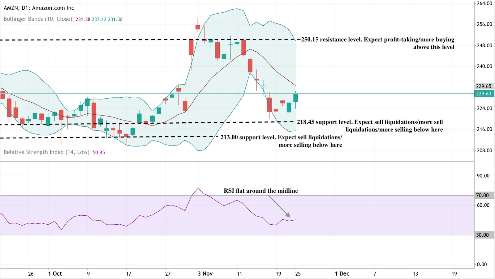 The RSI sits near 50, signalling neutral momentum and suggesting the market is still digesting the recent pullback. Directional conviction may not emerge until broader sentiment around AI spending turns clearer.