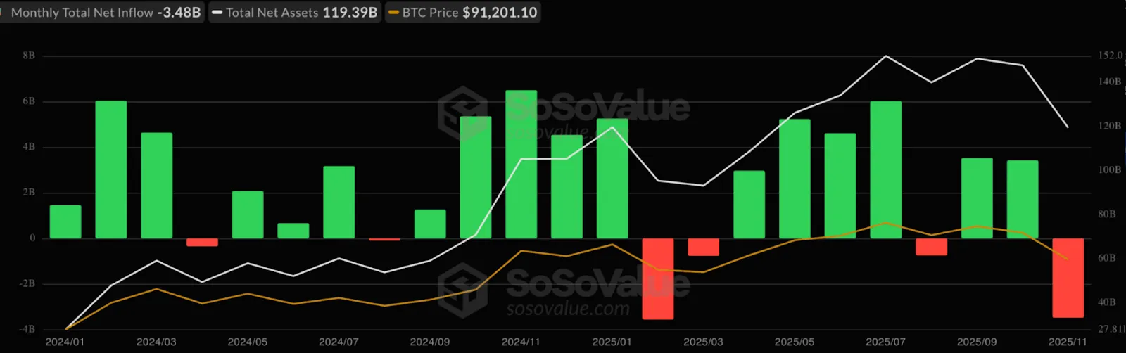 Bitcoin ETFs have swung from being a major source of demand to a meaningful source of supply. In November, they recorded around $3.5 billion in net outflows, adding selling pressure during an already unstable period. Their size means ETF flows now play a material role in shaping short-term price action.