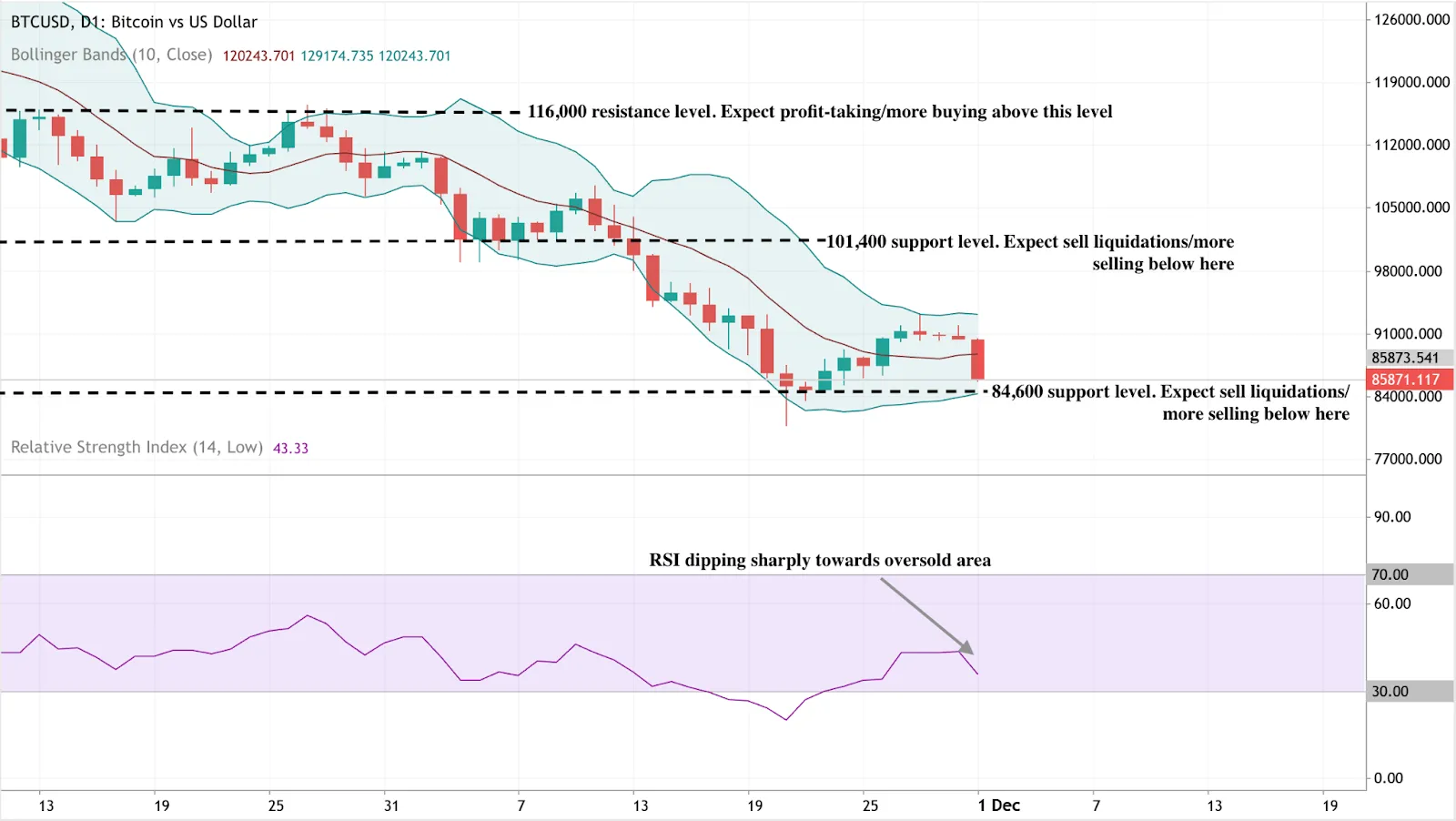 At the start of writing, Bitcoin (BTC/USD) has slipped back toward $85,800, losing momentum after a brief stabilisation phase. The immediate downside focus remains on the key $84,600 support zone - a level where a break could trigger sell liquidations and open the door to deeper declines. Above price, the next major thresholds sit at $101,400 and $116,000, where any recovery rally is likely to encounter profit-taking or renewed buying interest.