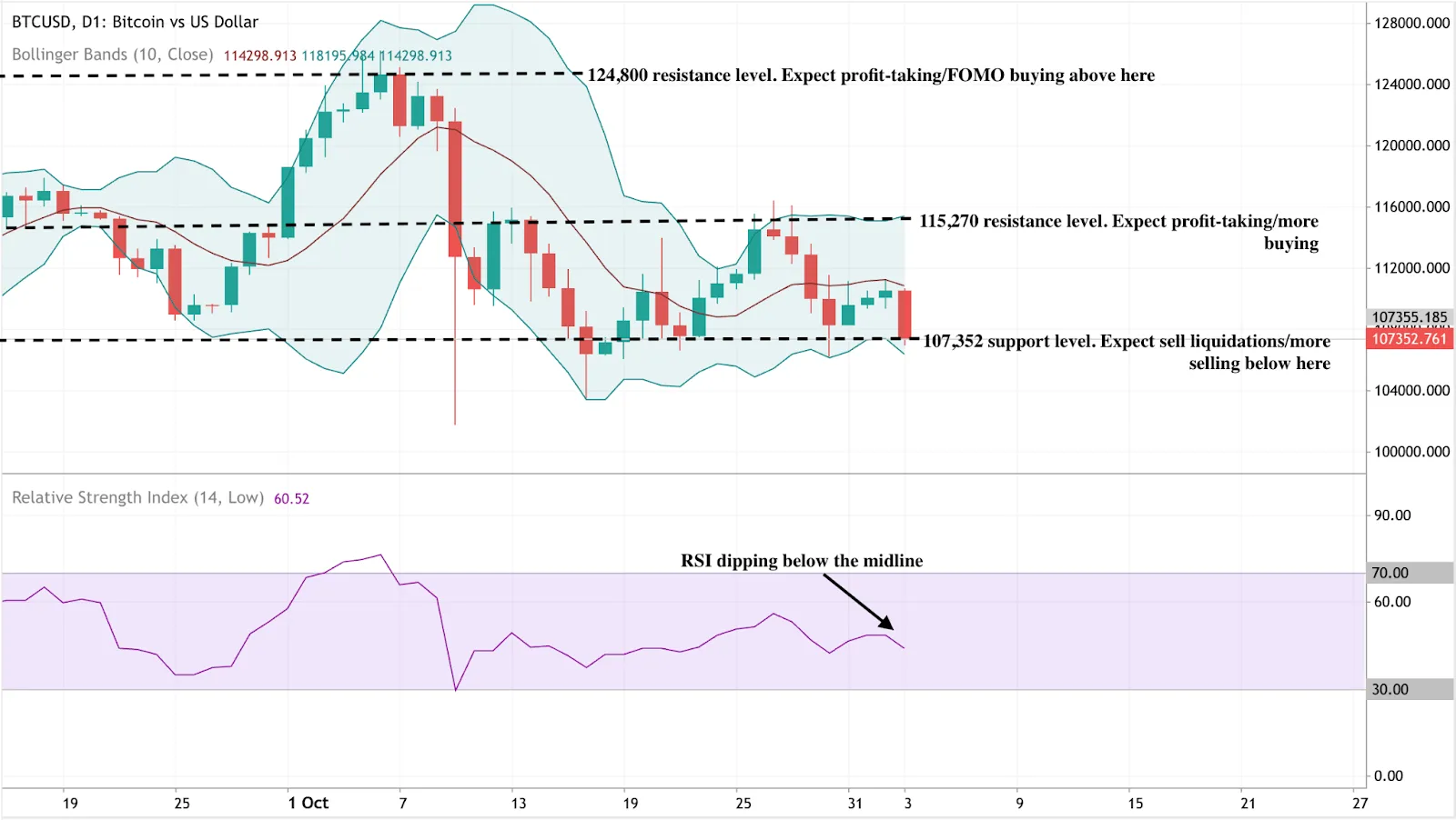The RSI sits below the neutral 50 mark, showing soft momentum, while Bollinger Bands have tightened - often a sign that volatility is about to pick up.