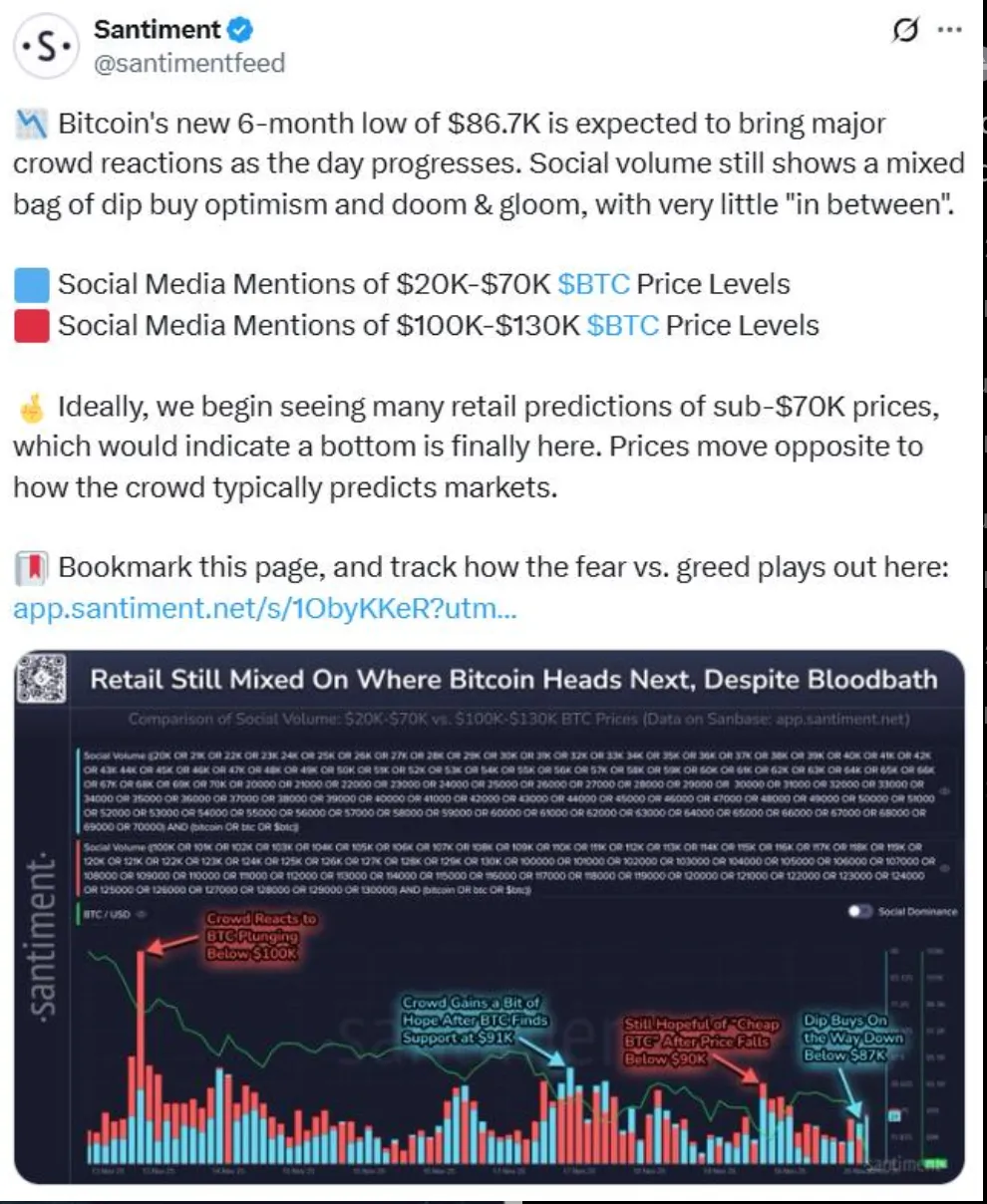 Psychologically, this is a new phase. The retail frenzy that once defined Bitcoin’s DNA - seen vividly during Thanksgiving 2017 when it first hit $10,000 - is subdued. Santiment data shows sentiment almost evenly divided between calls for a plunge below $70,000 and hopes of a rally past $130,000. That polarity signals confusion and caution rather than conviction. Fear, rather than fundamentals, is currently driving the market.