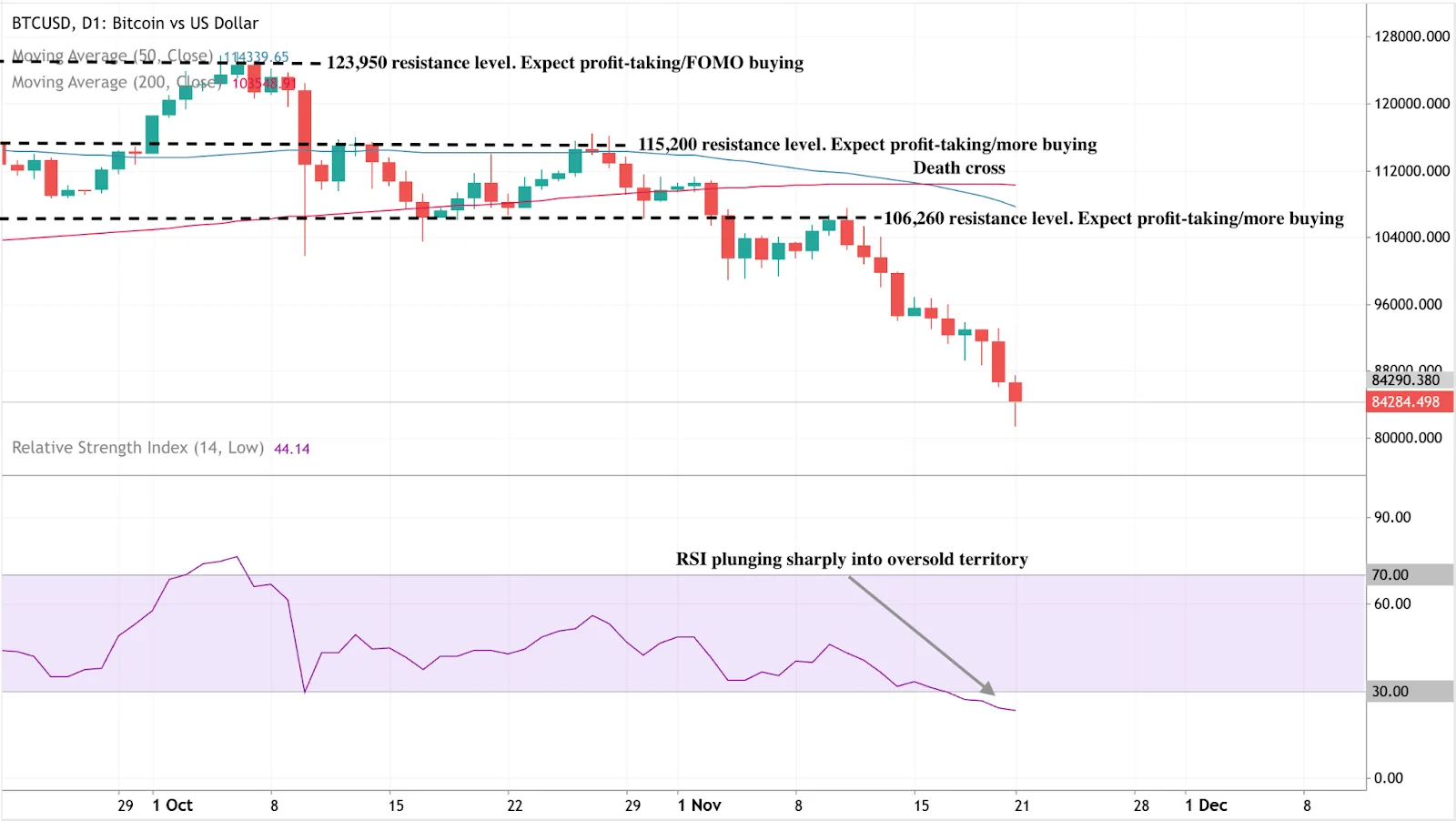 A death cross, where the 50-day moving average slips below the 200-day, reinforces the bearish bias and hints at sustained downside risk. Resistance sits at $106,260, $115,200, and $123,950 - levels that could cap any rebound attempts. Unless Bitcoin can reclaim those zones, sentiment will likely stay fragile and volatility high.