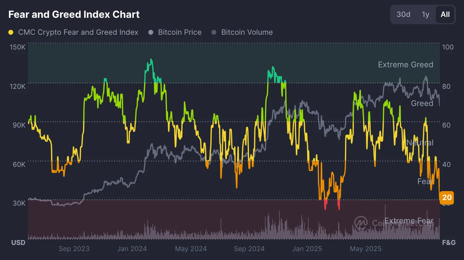 Market confidence has eroded rapidly. The Crypto Fear and Greed Index has plunged to 20, signaling deep investor unease after weeks of optimism.