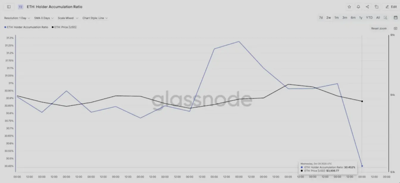 Glassnode data show the Holder Accumulation Ratio slipped from 31.27% to 30.45%, signaling reduced activity among long-term retail holders.