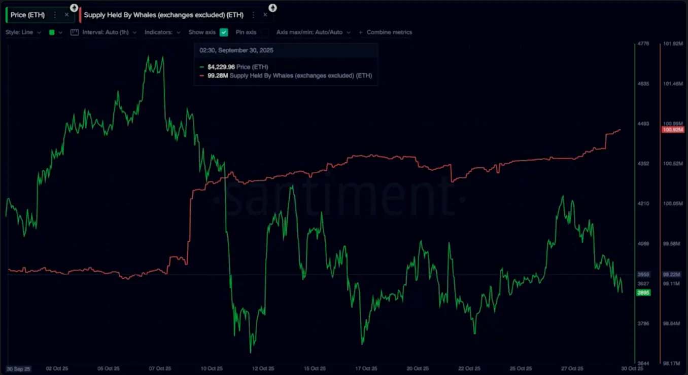 While headlines highlight fear, blockchain data tells a more nuanced story. Addresses holding 1,000–100,000 ETH grew their combined holdings from 99.28 million to 100.92 million ETH in October, according to Santiment.