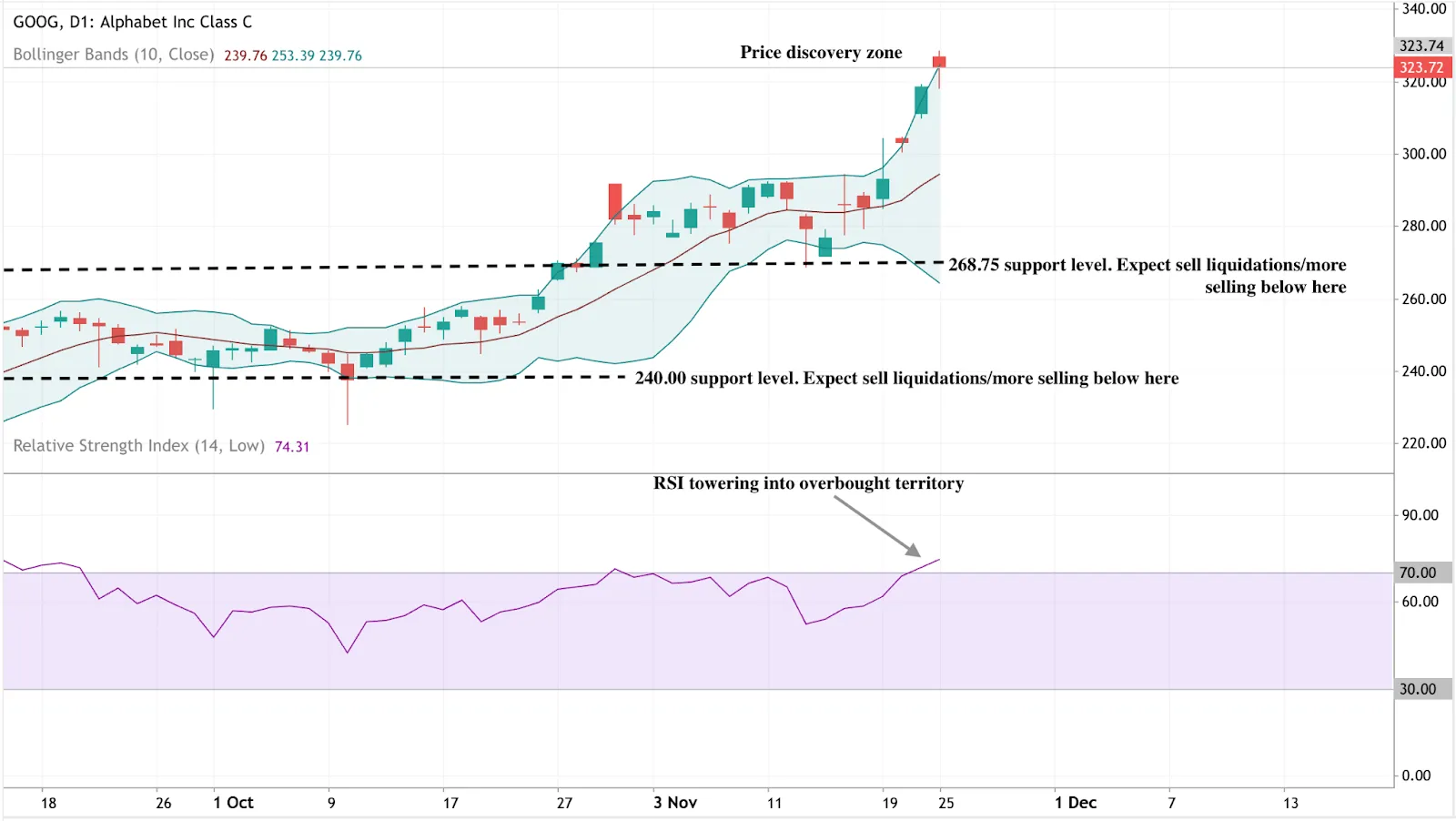 At the time of writing, Alphabet (GOOG) has pushed decisively into a price discovery area above $323, extending a strong breakout along the upper Bollinger Band. The $268.75 and $240 levels remain key supports; a sustained move below either could trigger heavier selling pressure or prompt a broader pullback.