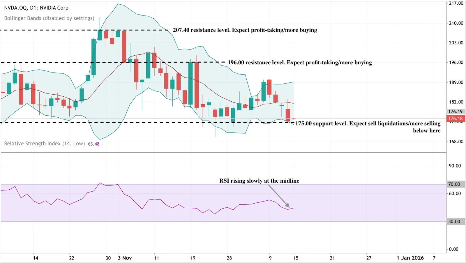At the time of writing, NVIDIA (NVDA) is trading around $176, holding just above the key $175.00 support level. This area remains crucial for determining the near-term direction. A sustained move below it could accelerate downside pressure, while holding above it leaves room for stabilisation.
