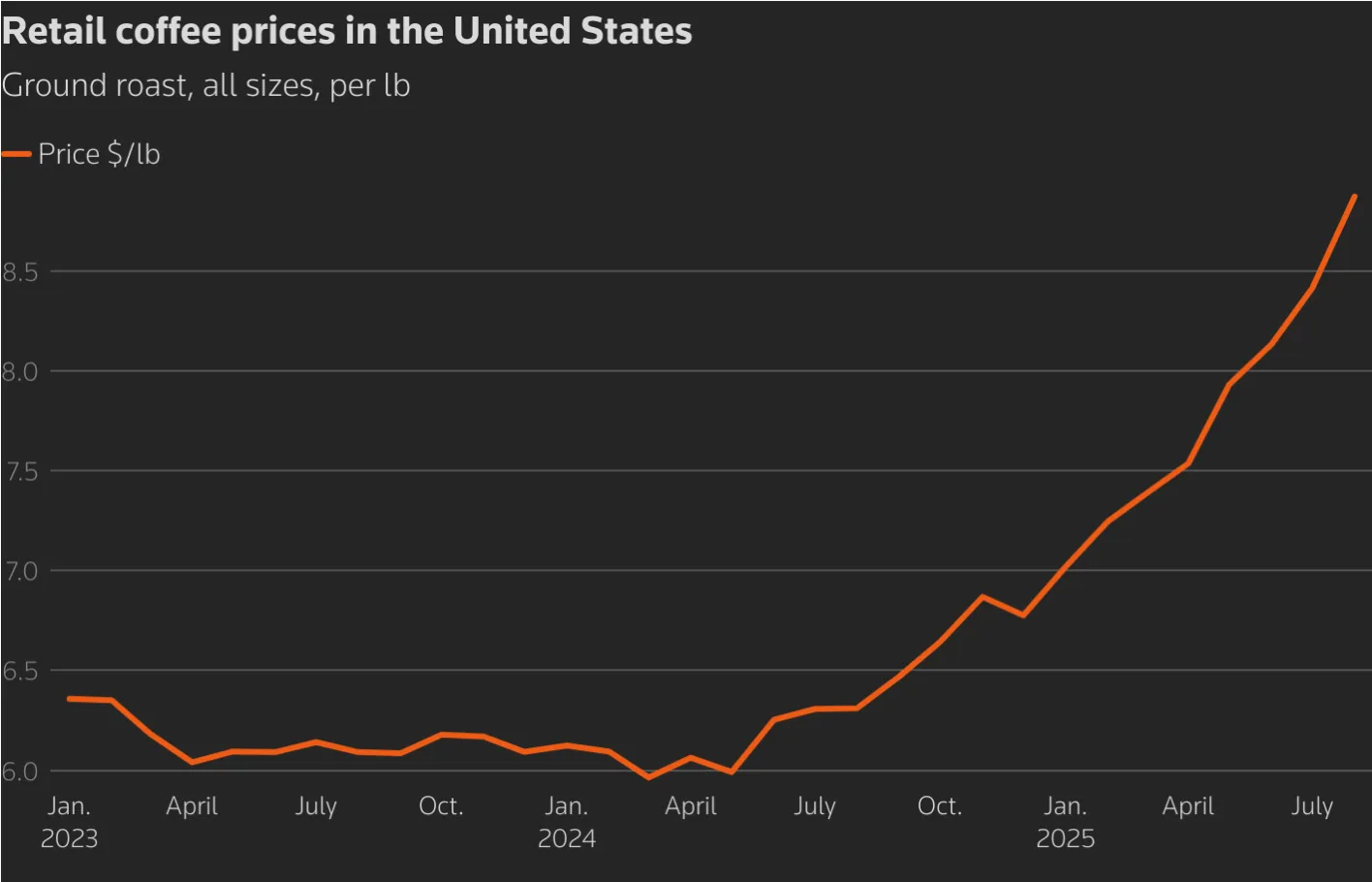 Very. The U.S. consumes around 25 million bags annually, with a third sourced from Brazil. With tariffs in place and inventories shrinking, retail coffee prices have become a major contributor to food inflation.