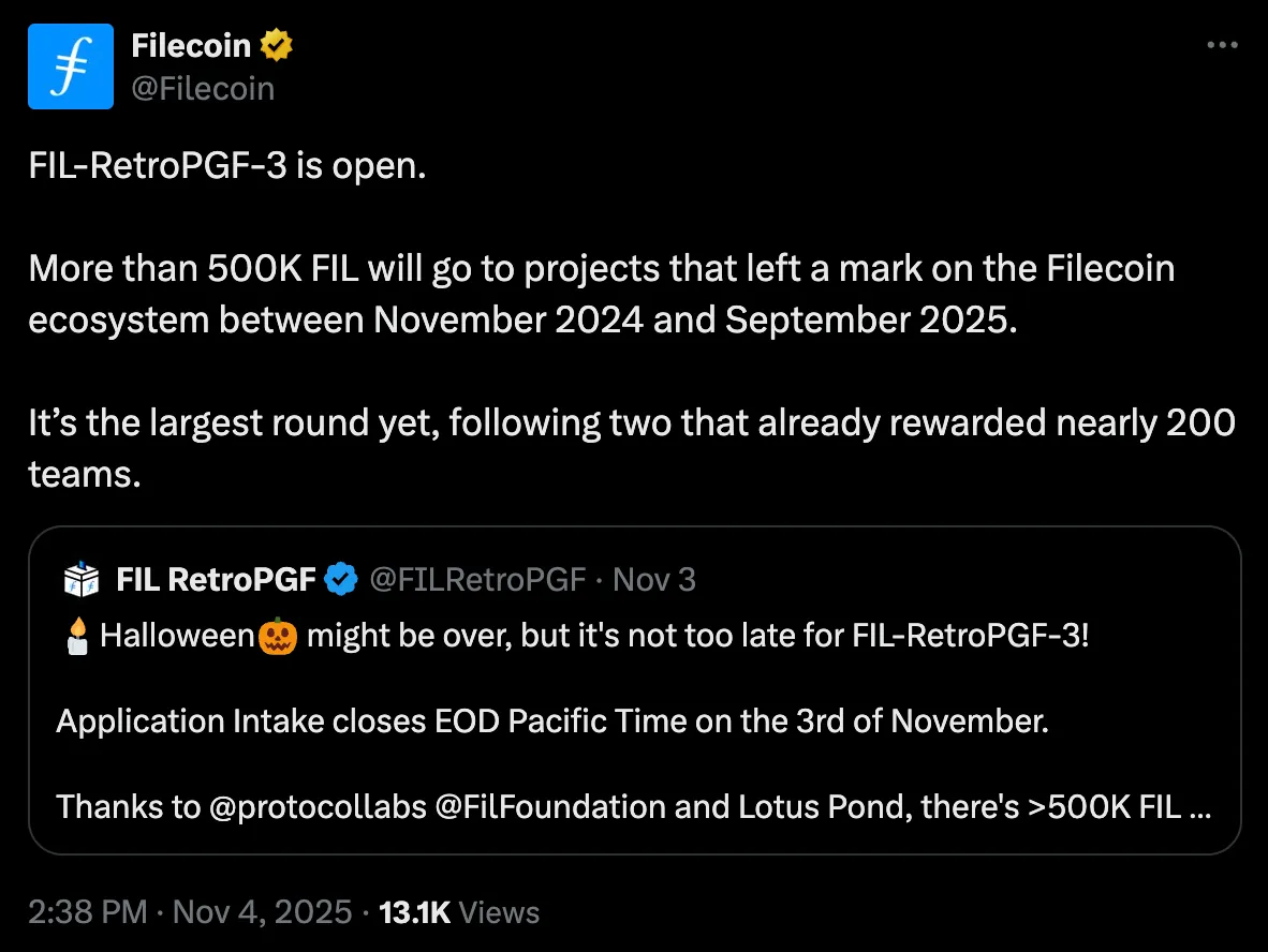 - Ecosystem support expanding: Protocol Labs’ RetroPGF Round 3 introduces 585,000 FIL in grants for developer projects between November 2024 and September 2025.