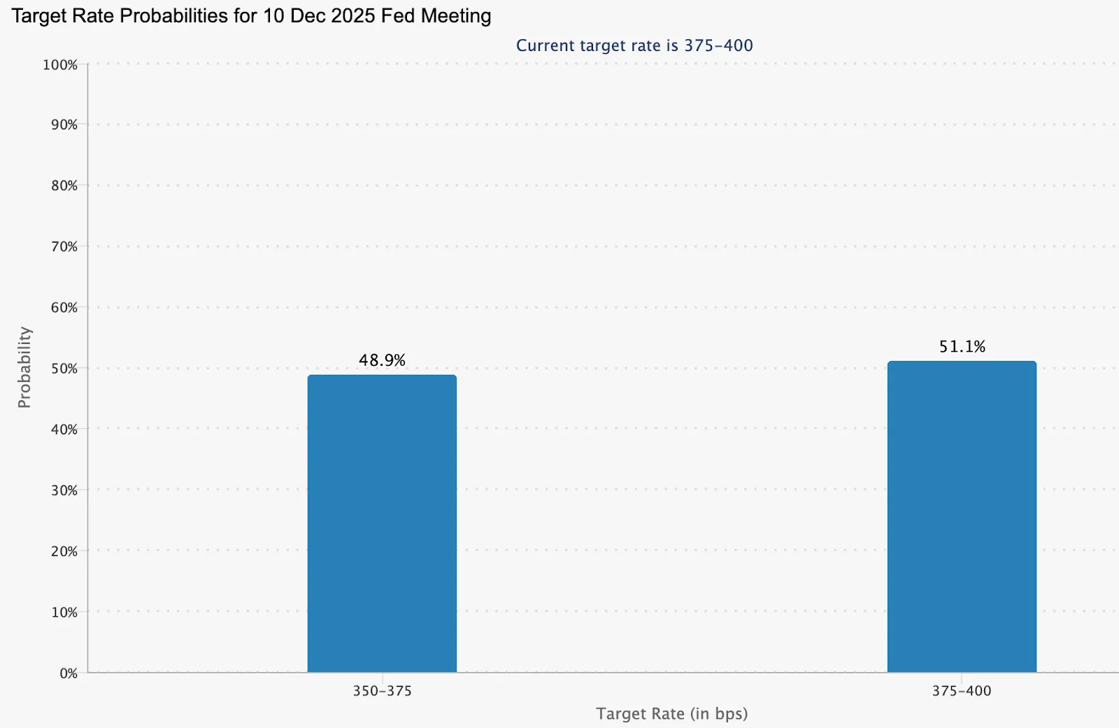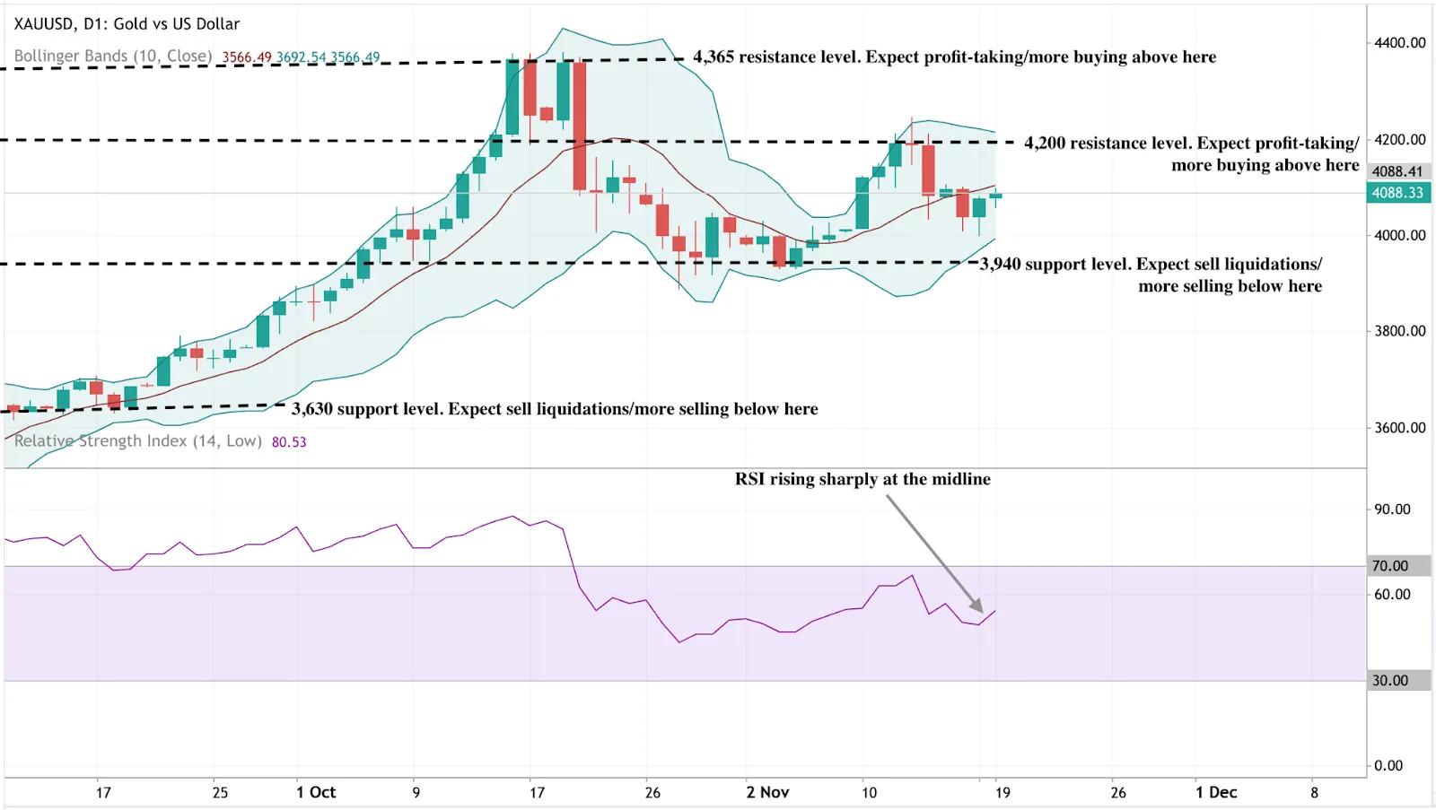 Now, with traders recalibrating expectations for a December rate cut - pricing in a 48.9% chance, according to CME FedWatch - the metal has eased back towards its midpoint around $4,050–$4,100, where short- and long-term averages converge.
