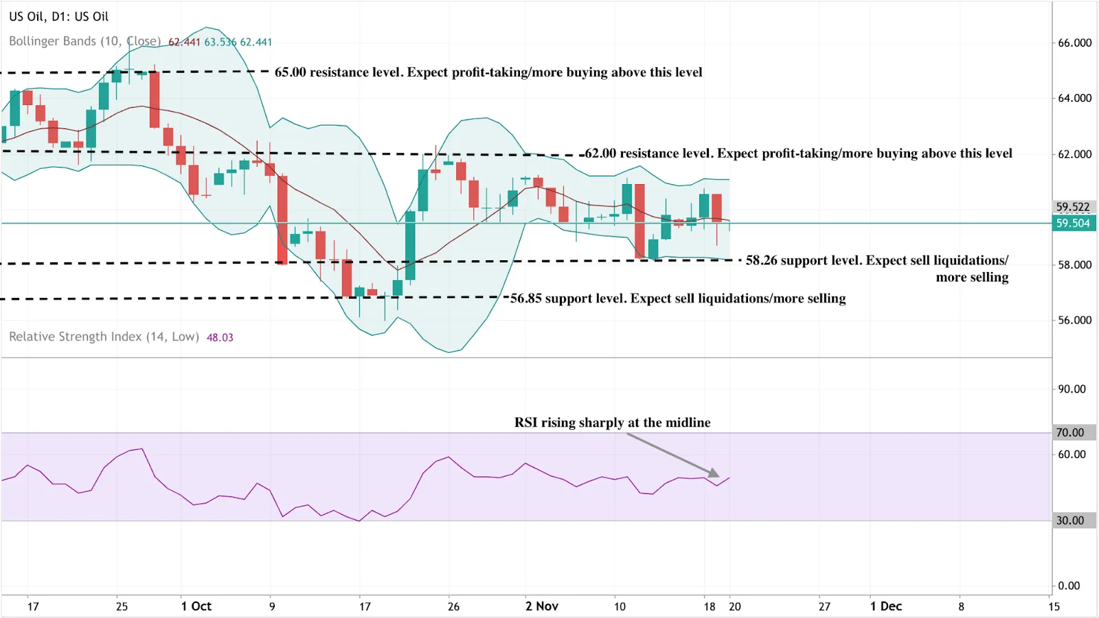 At the time of writing, U.S. crude trades around $59.50 per barrel, consolidating within a narrow range as momentum stabilises. The RSI has climbed back above 50, signalling a slight uptick in bullish sentiment. Meanwhile, the Bollinger Bands (10, close) have tightened, suggesting reduced volatility and an approaching breakout.